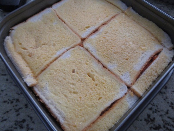 5- En una bandeja engrasada de unos 24x24 cm. Tapar agujeros con tiras de pan, aplastantdo un poco.Colocar 4 rebanadas de pan de molde, empapar con un huevo batido y extender la mitad del tomate. Tapar con mas pan, huevo y tomate y terminar con pan y huevo batido.