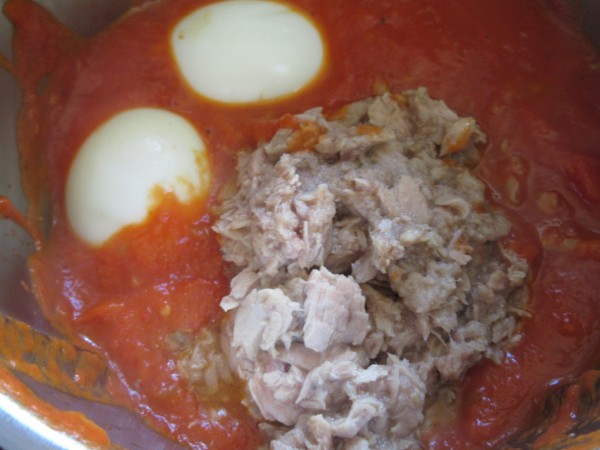 4- Añadir los huevos cocidos y el atún , 2 seg. vel.5.