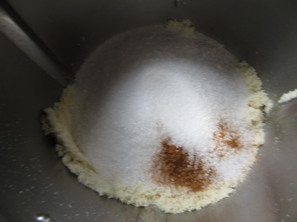2- Moler las almendras, 10 seg. vel.8. Despegar paredes y fondo. Añadir el azúcar, ralladura, canela, pellizco sal, 10 seg. vel.5. Agregar los huevos, 10 seg. vel.5. Despegar paredes y otros 10 seg. vel. 5.