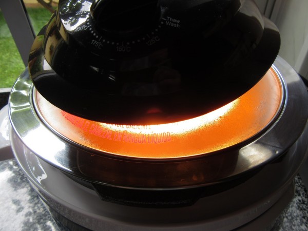 2- Volcar en la cubeta engrasada o forrada de papel de hornear, válvula abierta, menú horno, 35 minutos, 120º. Cancelar menú y colocar el cabezal unos 8-10 minutos a 200º, hasta que tome color.