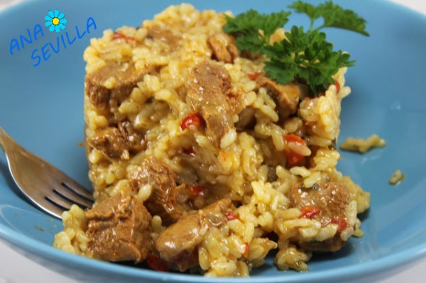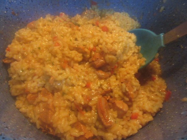 4- A continuación el solomillo adobado,sofreír un poco removiendo bien. Y lo mismo con el arroz.