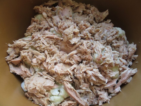 Preparación:1- Cortar en ramilletes pequeños la coliflor lavada, colocar la rejilla en la cubeta, la coliflor y agua y sal, válvula cerrada,presión vapor, 4-5 minutos, 130º, media presión. Escurrir, quitar la rejilla, reservar en la cubeta y cubrir con el atún desmigado. Reservar.