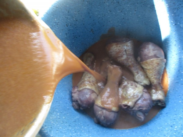 5- Sacar el pollo a una cazuela, quitar la mariposa y retirar el laurel. Triturar la salsa 30 seg. vel.8. Volcar sobre el pollo y dar un hervor destapado para reducir un poco la salsa.