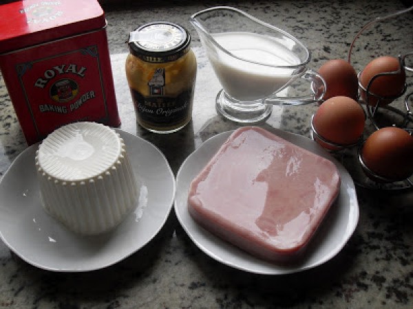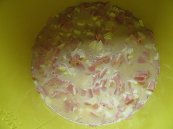 1- Picar en trocitos el jamón y queso. Triturar con el turmix o thermomix 20 seg. vel.5, los huevos, mostaza, sal, harina, levadura, pimienta y leche. Mezclar con la picada.