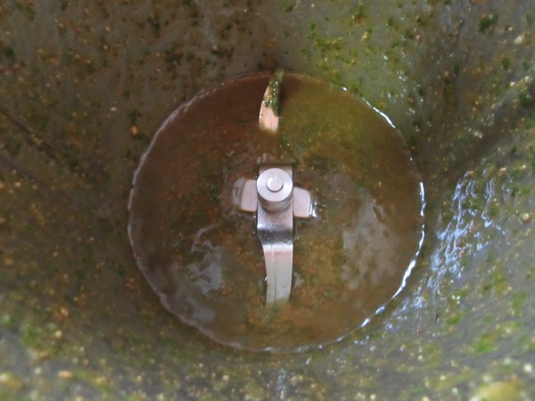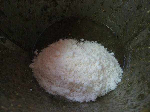5- Agregar el aceite y sal y emulsionar 10 seg. vel.6. Después el agua y queso rallado y volver a triturar, 10 seg. vel.8.