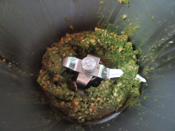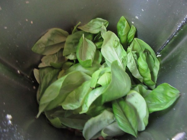 4- Añadir los piñones, las hojas de albahaca (los tallos no), 10 seg. vel.5. Bajar restos.