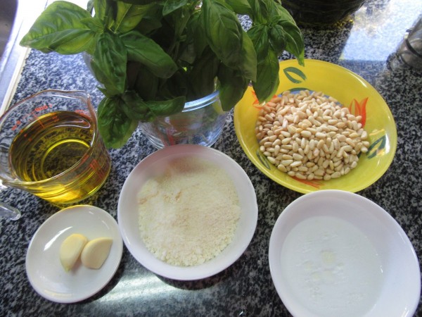Ya todos los ingredientes preparados, con albahaca que planto yo todos los años. Hacemos la salsa en un periquete