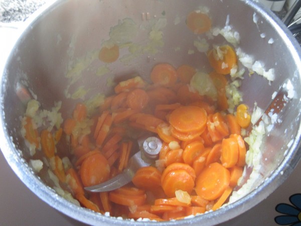 1- Picar cebolla 2 seg. vel.5. Bajar restos, añadir la zanahoria en rodajas y el aceite y pochar 10 min. Varoma. vel. cuchara.