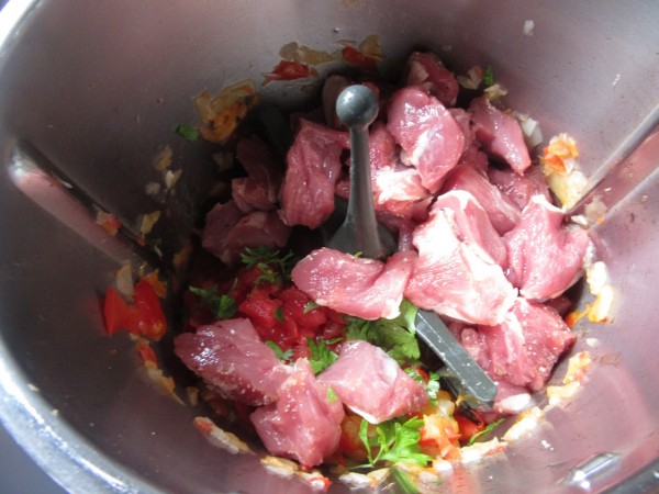 4- Colocar la mariposa, tomate, laurel, perejil, vino blanco y cordero troceado, 15 min. Varoma, vel. cuchara.