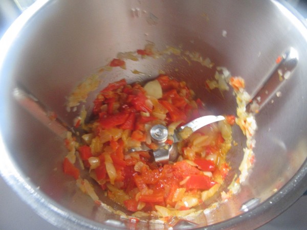 2- Picar la cebolla, ajos y pimiento 4 seg. vel.4. Bajar restos hacia las cuchillas, añadir el aceite y sofreír 10 min. Varoma, vel. cuchara.Varoma, vel. cuchara.