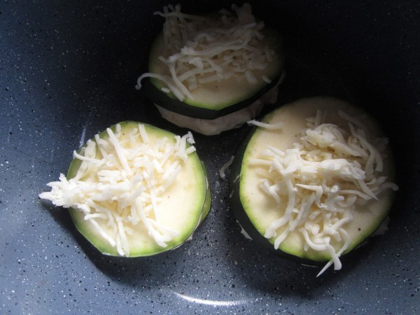 3- Extender un buen montoncito de bechamel sobre el centro de la mitad de rodajas de calabacín. Tapar con otra rodaja de calabacín apretando un poquito. Colocar en tandas en la cubeta, espolvorear queso rallado y dorar con el cabezal a 200º unos 15 minutos.