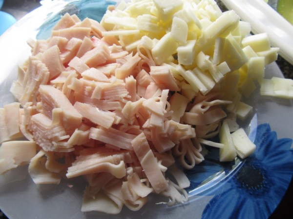 2- Secar la cubeta, hacemos la bechamel: Calentar una cda. de aceite junto a la mantequilla, en función freír. Añadir la harina y remover bien. Echar la leche poco a poco, hasta que se forme una ligera bechamel, salpimentar y poner un pizco de nuez moscada.Agregar las lonchas de jamón y queso picado y mezclar bien.