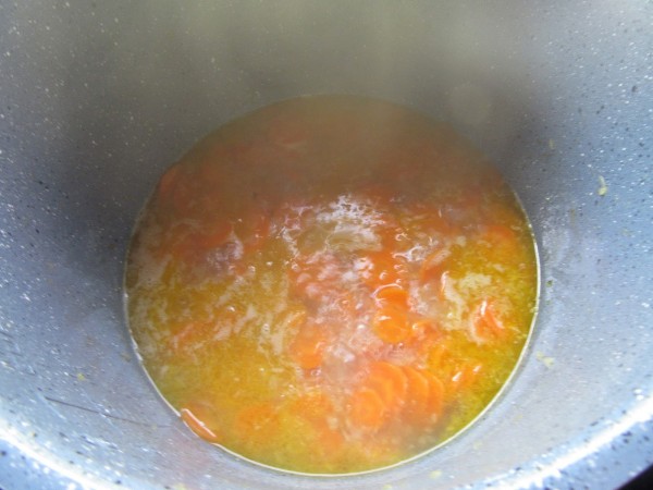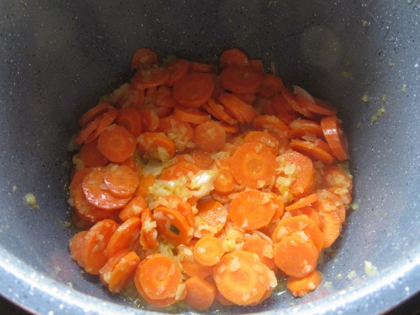 1- Sin lavar la cubeta, picar cebolla menuda y la zanahoria en rodajas y sofreír unos 10 minutos hasta que esté bien pochado.