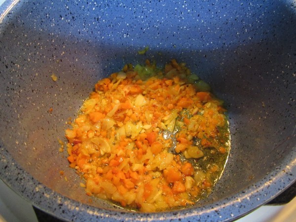 2- Picar menudos la cebolla, zanahoria y ajos, y pochar en sofreir unos minutos con aceite, hasta que esté blando.