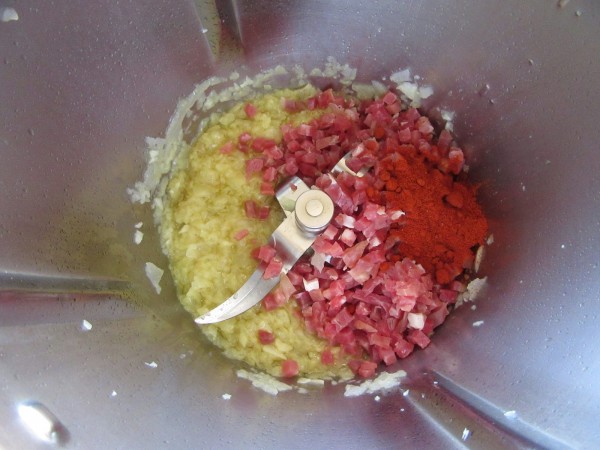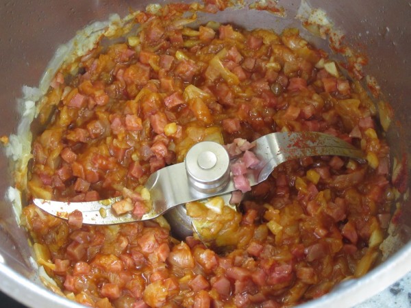 3- Retirar el varoma agregar al vaso el jamón picado y el pimentón y sofreír, 2 min. 100º, giro izda., vel. cuchara.