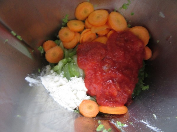 3-. Agregar la harina, zanahoria en rodajas y tomate, 4 min. Varoma, vel, cuchara.