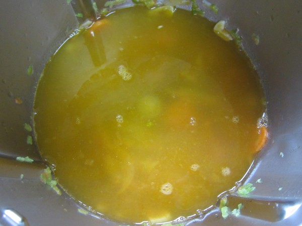 4- Añadir el vino blanco, caldo de pollo, zumo de naranja, pimienta y sal, colocar el varoma en su posición, 42-45 min. Varoma, vel.2.