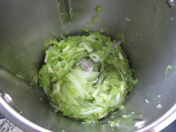 2- Picar el pimiento verde, 4 seg. vel.4. Bajar restos, añadir la cebolla, ajos en láminas y aceite y sofreír, 12 min. Varoma, vel, cuchara, sin cubilete.