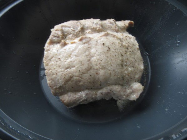 1- Salpimentar la pieza de lomo y colocar en el fondo del varoma. Cortar la cebolla en pluma y los ajos en láminas. Reservar.