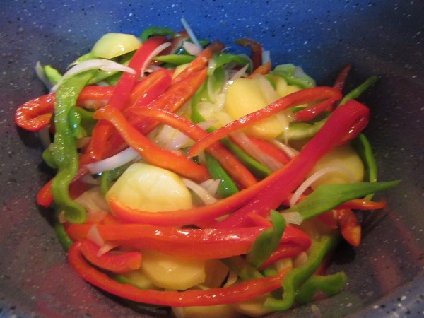 Preparación:1- Calentar el aceite en menú freír 180º-200º, 15 minutos, hasta que descuente tiempo. Añadir la cebolla cortada en pluma, patatas en rodajas panaderas no muy finas, los pimientos en tiras no trozos a gustos, los ajos en láminas y 1 cta. sal, pochar hasta que termine el tiempo, removiendo de vez en cuando.