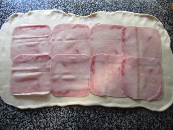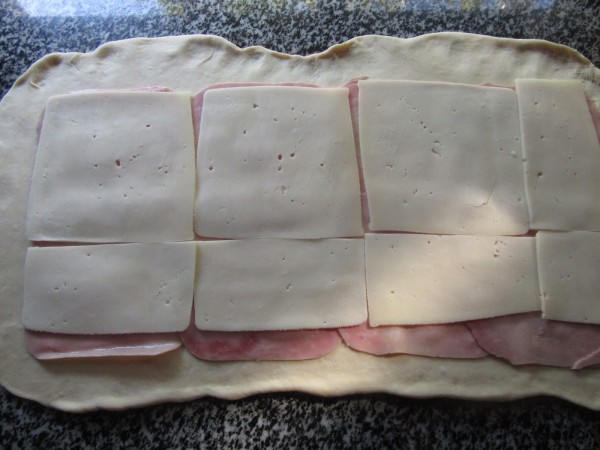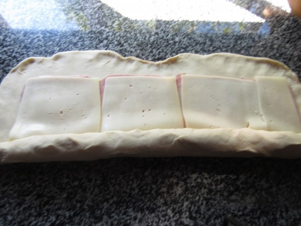 Estirar la masa formándo un rectángulo e ir poniendo el relleno