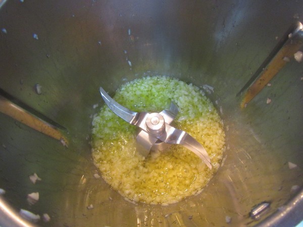 2- Picar los ajos, 5 seg. vel.5. Bajar restos hacia las cuchillas, añadir el aceite y sofreír 5 min. Varoma, vel. cuchara.