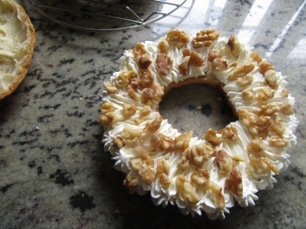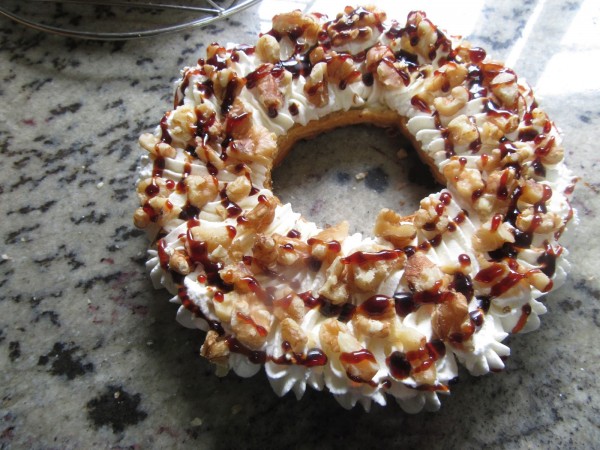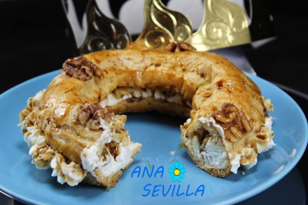 8- Montar la nata con el azúcar glas y la vainilla, a vel. 4 y 1/2. Cortar por la mitad cada corona, rellenar con la nata, repartir trozos de nueces e hilos de caramelo. Tapar y a la hora de servir con chorritos de caramelo por encima.