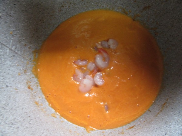 5- Despresurizar, agregar el caldo de pescado, la maicena y perejil, triturar la salsa. Devolver a la cubeta, repartir unas 50 gr. de gambas enteras, colocar la rejilla en el fondo y encima el pescado y cocer, válvula cerrada, 3 minutos, Vapor, 120º, media presión.