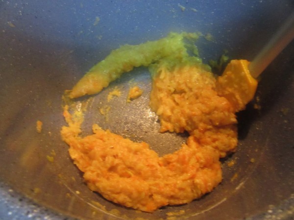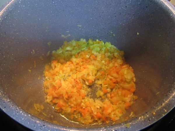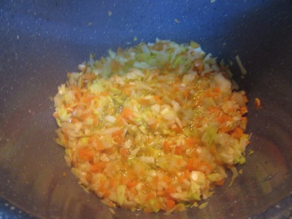 2- Picar la cebolla, zanahoria y puerro, menudos y pochar unos 8-10 minutos en un chorro de aceite, hasta que esté blando en menú freír 160º.