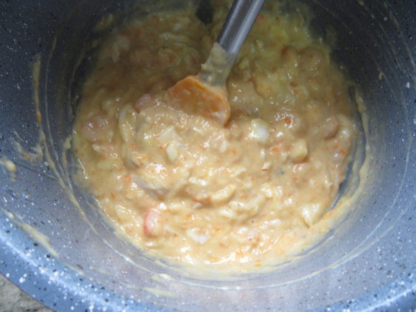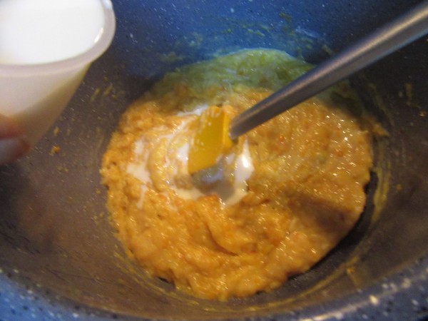 5- Ir añadiendo poco a poco la leche, sal, pimienta y nuez moscada, válvula cerrada, menú guiso, 3 minutos, 110º, media presión. Añadir el pescado , mezclar bien.