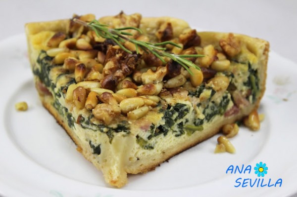 Preparación:1- Sofreír los ajos picaditos en un chorrito de aceite en plancha. Cuando comiencen a dorar, añadir el bacon y sofreír un poco. Agregar las espinacas y y sofreír hasta que bajen de volumen.