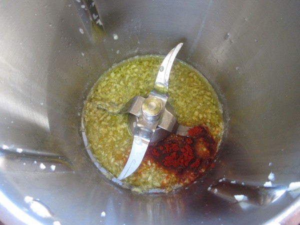 2- Picar los ajos, 5 seg. vel.5. Bajar restos hacia las cuchillas, añadir el aceite y sofreír 5 min. 100º, vel.cuchara.