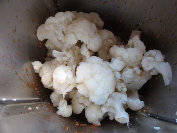 3- Agregar el pimentón y mezclar 5 seg. vel.3.A continuación la coliflor y sal y mezclar 5 seg. giro izda, vel.4. Reservar.