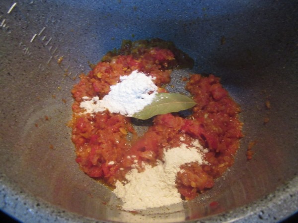 1- En un poco de aceite pochar la cebolla y ajos picados, hasta que esté transparente. Agregar el tomate troceado, pimentón y azafrán, válvula cerrada , menú turbo, 3 minutos, 130º, alta presión. Añadir la harina y sofreír un par de minutos.