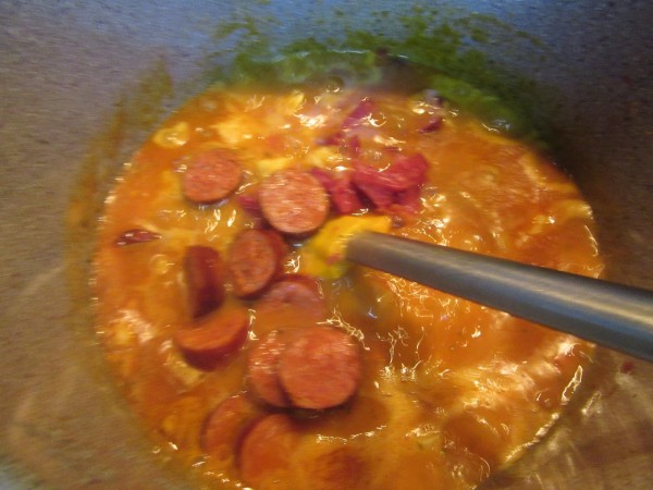 2- Válvula cerrada, menú turbo, 30 minutos, 140º, alta presión. Colar el caldo, trocear el chorizo y la punta de jamón. Reservar.