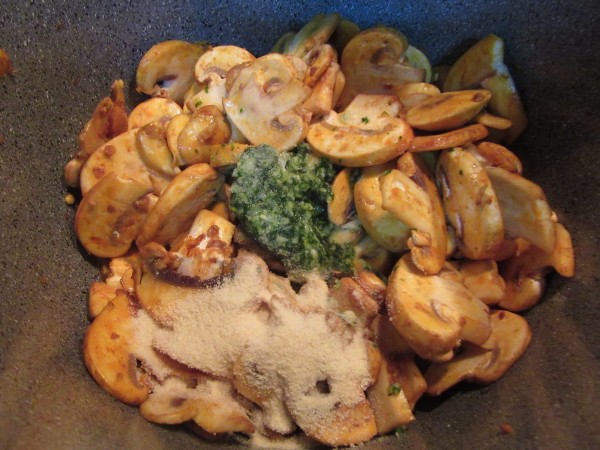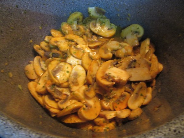3- Agregar los champiñones laminados y el pimentón, y sofreír unos 5 minutos removiendo bien, que reduzcan.