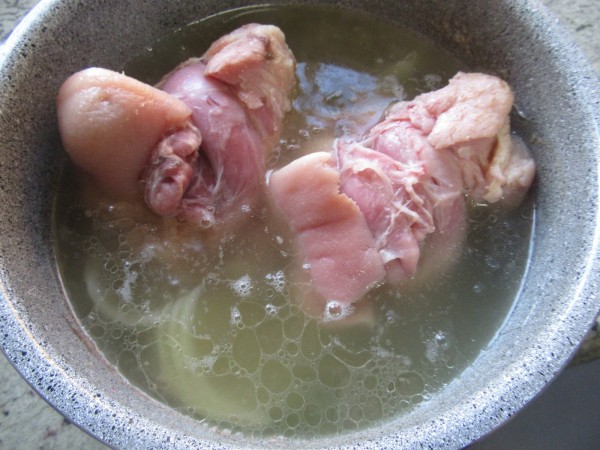 2- Colocar los codillos en la cubeta, la cebolla grande en pluma, ajos enteros, vino blanco, coñac, caldo cocción, sal (Yo no le pongo, el codillo ya es salado) y un chorro de aceite:
