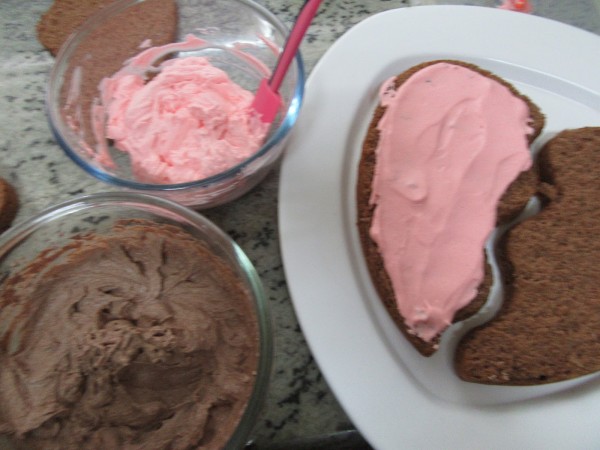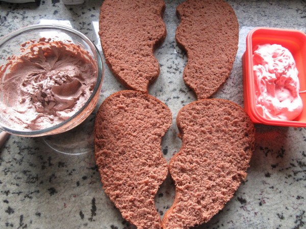-Cortar el bizcocho en 2 partes y por la mitad, si no tenéis un molde partido. Pincelar con almíbar y rellenar. Tapar, almibarar y cubrir con el resto de la trufa y nata.