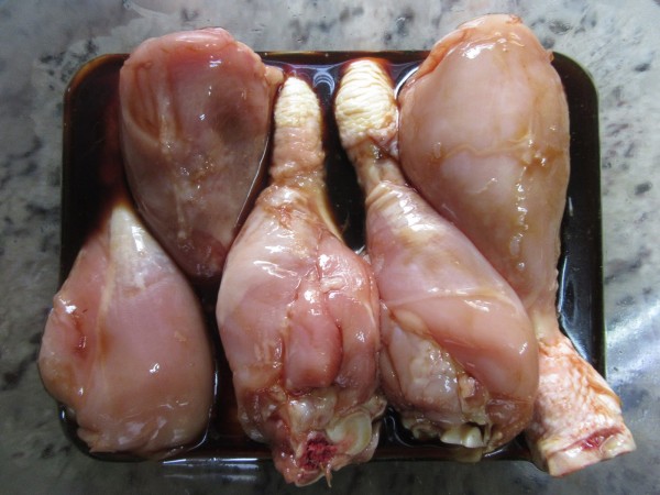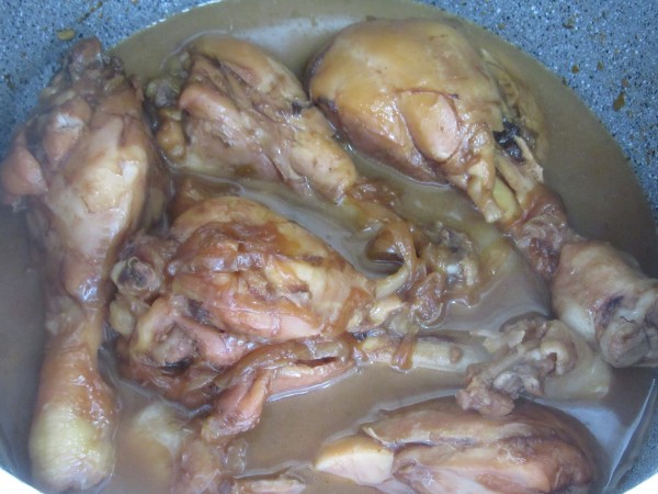 2- Poner en el vaso, la salsa de soja, el vino dulce y seco, azúcar moreno y jengibre, 5 min. Varoma, vel.2. Dejar enfriar en un bol. Cubrir el pollo y dejar macerar una media hora, removiendo de vez en cuando, para que tome sabor y se impregne bien.