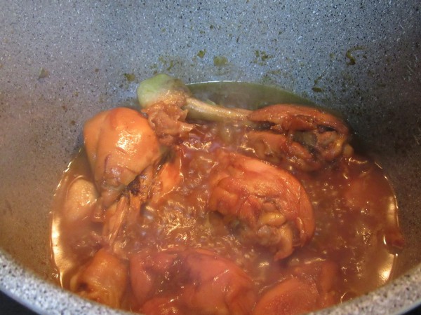 4- Colocar la mariposa y los jamoncitos, añadir la salsa de maceración, caldo de pollo, 40-45 min. Varoma, vel. cuchara, sin cubilete, colocar el cestillo en su lugar para evitar salpicaduras.