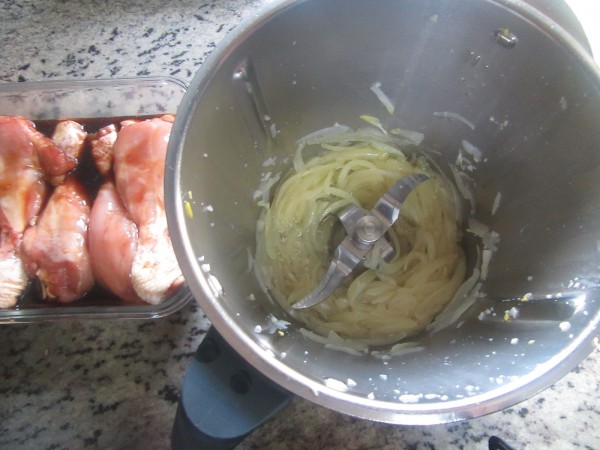 3- Mientras, cortar la cebolla en pluma fina, en juliana y sofreír con el aceite, 10 min. Varoma, vel. cuchara.
