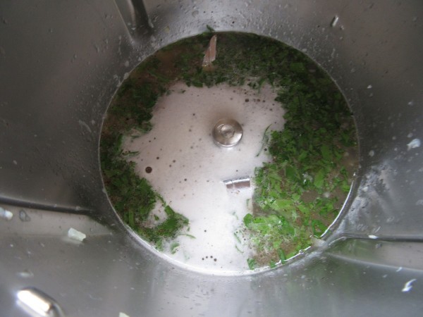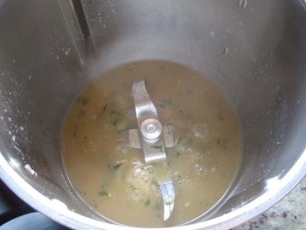 4- Cerveza, fumet, perejil picado, sal (Poca) y pimienta, colocar el varoma en su posición, 18-20 min. Varoma, vel.2. Retirar el varoma y triturar 10 seg. vel.8.