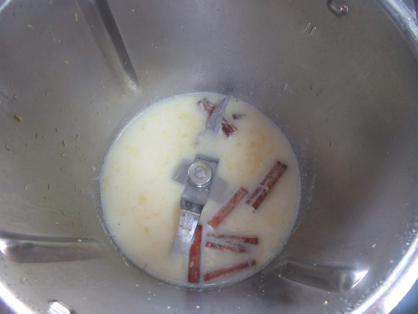 1- Leche, palos de canela partidos en 2, ralladura y azúcar, (Ó aromas), 5 min., 100º, vel. cuchara. Dejar infusionar tapado 10 minutos.