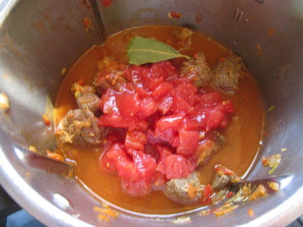 4- Añadir el tomate, vino blanco, laurel y azúcar, 45-50 min. 100º, giro izda, vel. cuchara, sin cubilete, colocar el cestillo en su lugar para evitar salpicaduras.