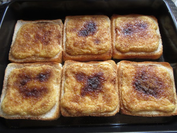 2- Colocar las rebanadas en una fuente engrasada de horno y mojar con el almíbar. (Sin corteza quedan aún más borrachitas). Cubrir cada rebanada con las *natillas, espolvorear azúcar moreno abundante y canela y llevar al gratinador pre-calentado fuerte en la parte de arriba del horno, 4 ó 5 minutos. Vigilar , sólo que se caramelice. (Podéis usar el soplete).
