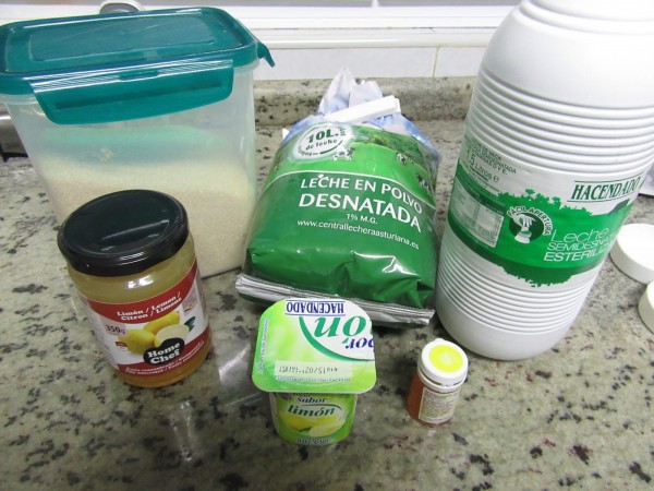 Mezclar y calentar la leche con el azúcar y leche en polvo, hasta que casi llegue a hervir en menú guiso, que humee. Dejar entibiar hasta que al meter el dedo no nos queme, como 40º-45º. Añadir el yogurt, pasta de limón y colorante y mezclar bien.