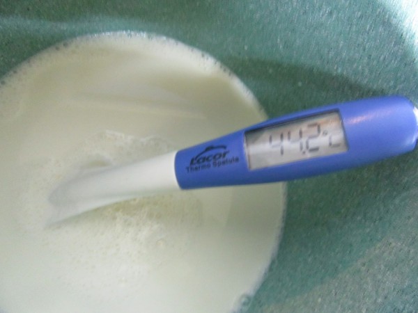 Mezclar y calentar la leche con el azúcar y leche en polvo, hasta que casi llegue a hervir, dejar entibiar hasta que al meter el dedo no nos queme, como 40º-45º. Añadir el yogurt, pasta de limón y colorante y mezclar bien.