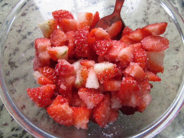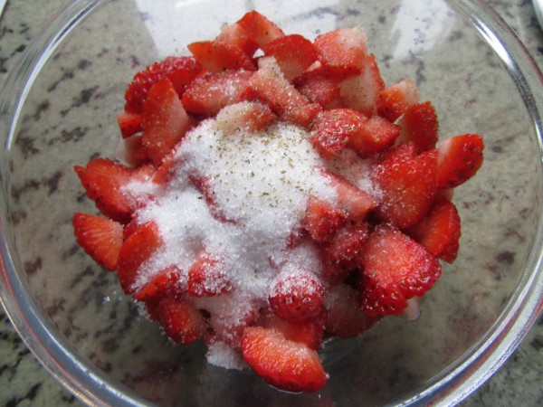 1- Cortar las fresas en trocitos, colocar en un cuenco, espolvorear 2 cdas. soperas de azúcar y la pimienta negra. Dejar macerar una hora, y dar vueltas de vez en cuando para que vayan macerando. Escurrir bien.