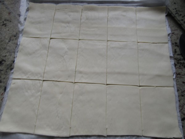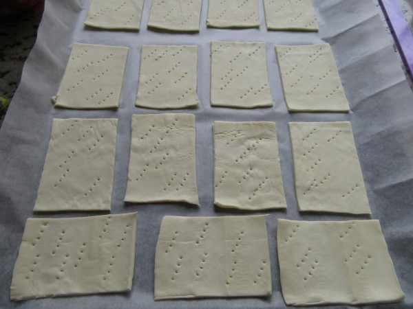 3- Precalentar el horno a 200º. Cortar el hojaldre en 15 rectángulos iguales, pinchar bien. Colocar encima papel de hornear y encima otra bandeja de horno. Hornear unos 15-18 minutos. Dejar enfriar.