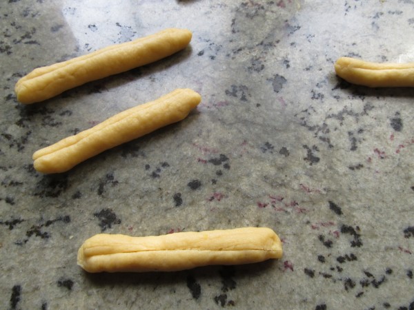 2- Hacer tiras con la masa, como un dedo de largas y hacer un corte transversal.